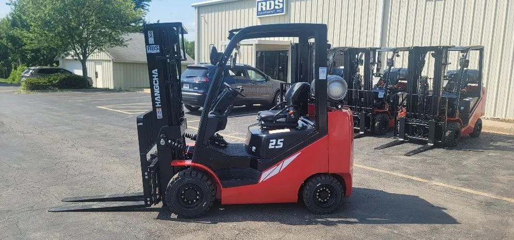 HC FP25CP forklift with 5,000 lb capacity. Compact pneumatic unit equipped with a triple stage mast and powered by LP gas. 4 matching units available. Call for pricing.