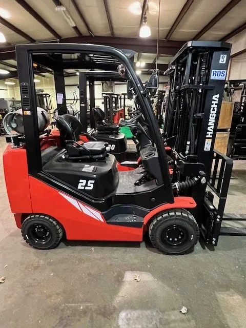 HC FP25CP compact pneumatic tired forklift with 5,000 lb rated capacity. Four units in stock. Powered by a Nissan K25 61 hp engine and LP gas fuel system without tank. Equipped with a 185″ triple stage mast, 4-way hydraulics, and Cascade side shift carriage. Includes standard 24-month or 4,000-hour machine warranty and free delivery in the Greater Kansas City area.